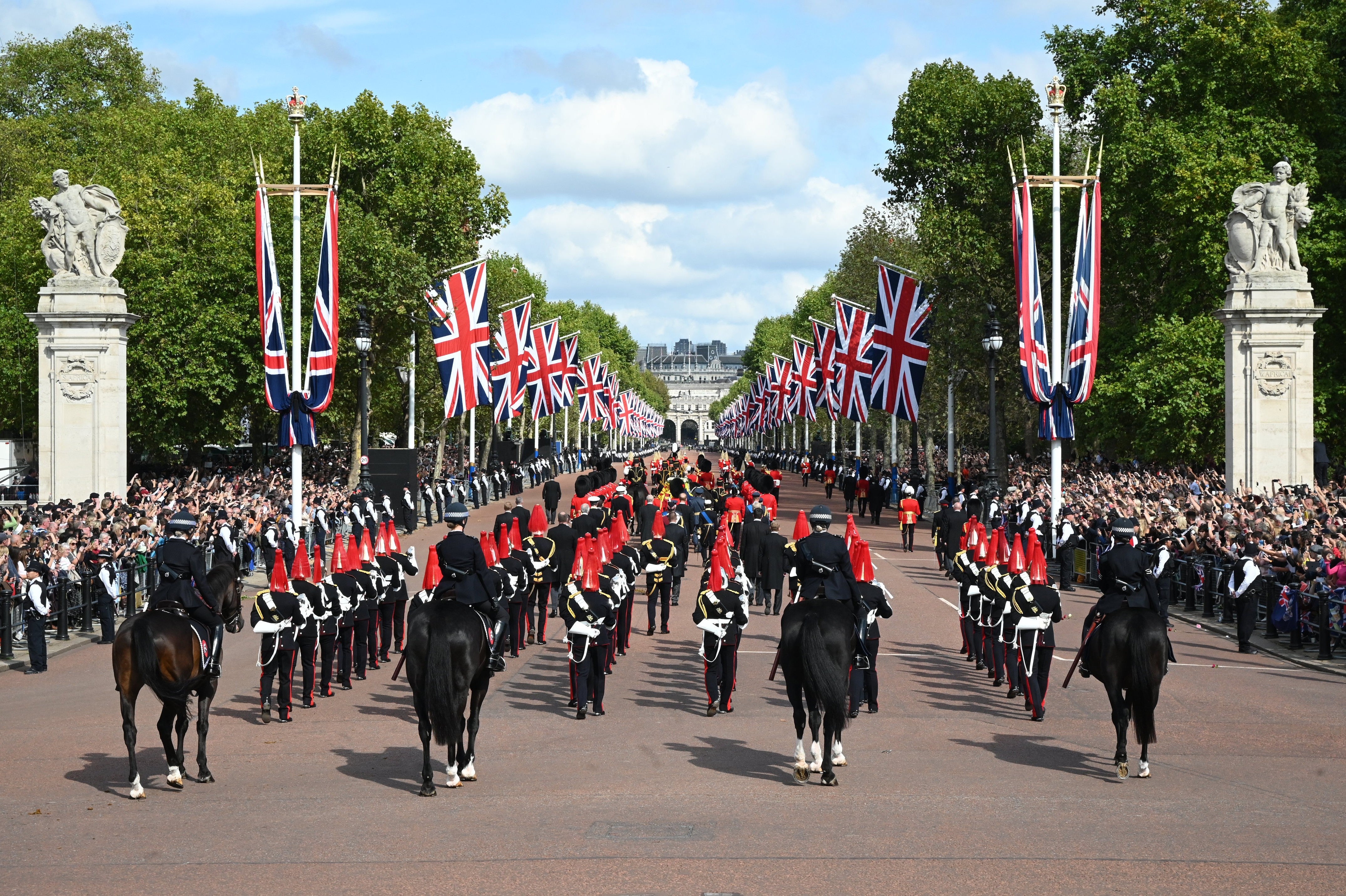 Weg zum Parlament. Der Weg führte über die von Dutzenden britischen Flaggen geschmückte Mall, scharf rechts zur Horse Guard, jener Einheit, die die Queen 70 Jahre lange im Palast bewachte. Dann waren es nur noch ein paar Meter bis zum Parlament – zu dem Westminster Hall ja gehört. In diesem ältesten Teil des Parlaments wurde der geschlossene Sarg der Queen schlussendlich aufgebahrt. Tausende säumten die Straßen und warteten Stunden, dass der Sarg an ihnen vorbeirollt – dabei hatte es stellenweise stark geregnet.