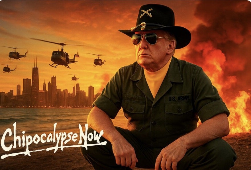 Begleitet wurde der Beitrag bei Truth Social von einem offenbar mit Hilfe von Künstlicher Intelligenz erstellten Bild des US-Präsidenten in Militärkleidung. Im Hintergrund sind Hubschrauber über der Skyline von Chicago zu sehen, dazu das Zitat: "Ich liebe den Geruch von Abschiebungen am Morgen" - alles Anspielungen auf den Film "Apocalypse Now" aus dem Jahr 1979.