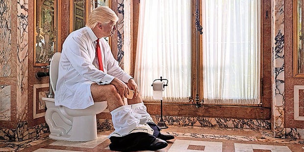Der Hollywood Reporter zeigt erste Auszüge. Trump erledigt die wichtigsten Geschäfte auf der Toilette (oben) und hat einen eigenen Haarspray-Assistenten.