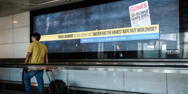 Auf einem großen Bildschirm am Istanbuler Flughafen prangerte die Schlagzeile: „Reisewarnung! Wissen Sie, dass Schweden das Land mit der höchsten Vergewaltigungsrate ist?“ Gesponsert wird die Werbung von der regierungsnahen Zeitung „Günes“.