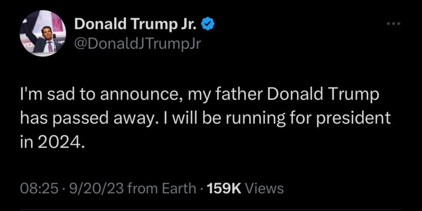 Der Account von Donald Trump Jr. wurde heute früh gehackt und mit skurrilen Posts überflutet. In einem der ersten Tweets wurde behauptet, dass sein Vater, Donald Trump, verstorben sei und er 2024 für das Präsidentenamt kandidieren werde.