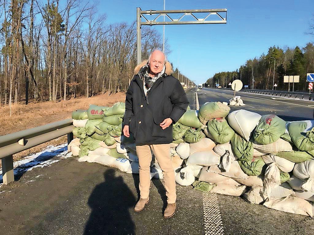 Makariw. 40 Kilometer vor Kiew. Es ist eiskalt, das Thermometer zeigt minus 2 Grad. Ein scharfer Wind weht, es hat leicht geschneit: Das letzte Hotel an der Autobahn M06 schließt für die Gäste. Es muss Platz gemacht werden für Soldaten der ukrainischen Armee. Wir müssen raus. Rasch. An allen Checkpoints entlang der Straßen herrscht plötzlich wieder Hektik, Anspannung.