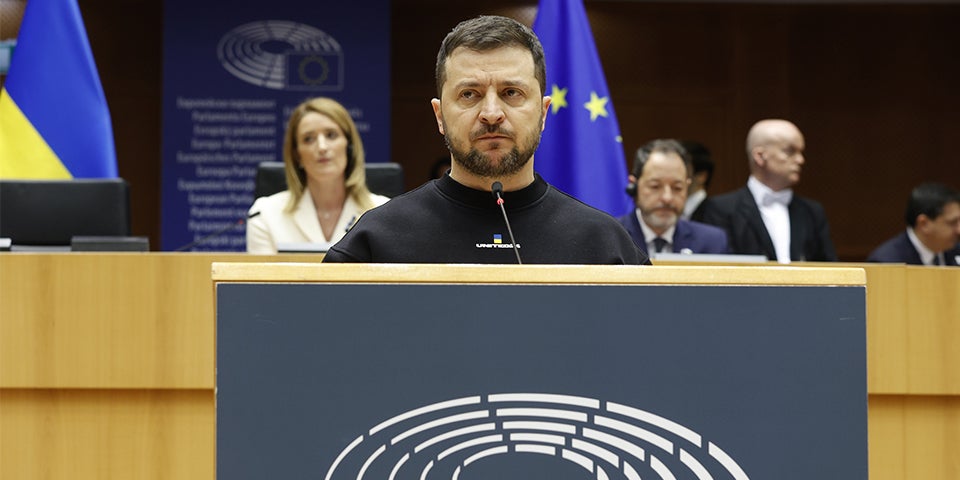 "Nun müssen die Staaten als nächsten Schritt erwägen, rasch weitreichende Systeme und Flugzeuge bereitzustellen", sagte sie. Diese würden benötigt, um die Freiheit zu schützen, die zu viele für selbstverständlich gehalten hätten. Anlässlich des Besuchs des ukrainischen Präsidenten Wolodymyr Selenskyj beim EU-Parlament und später beim EU-Gipfel in Brüssel erklärte sie: "Unsere Reaktion muss der Bedrohung angemessen sein - und die Bedrohung ist existenziell."