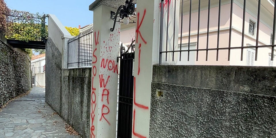 Bei einem zweiten Anschlag schütteten Unbekannte Farbe in den Pool, der sich daraufhin blutrot färbte. An das Eingangstor wurde Wladimir Solowjew, Mörder!“ gesprüht..