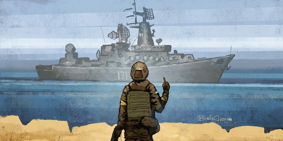 Anfang März schrieb die ukrainische Post einen Wettbewerb aus, um an das Ereignis zu erinnern. Nach über 500 Vorschlägen wurde die Illustration des Zeichners Boris Groh ausgewählt. Sie zeigt einen ukrainischen Soldaten, der auf gelbem Sand einem russischen Schiff den Stinkefinger zeigt.