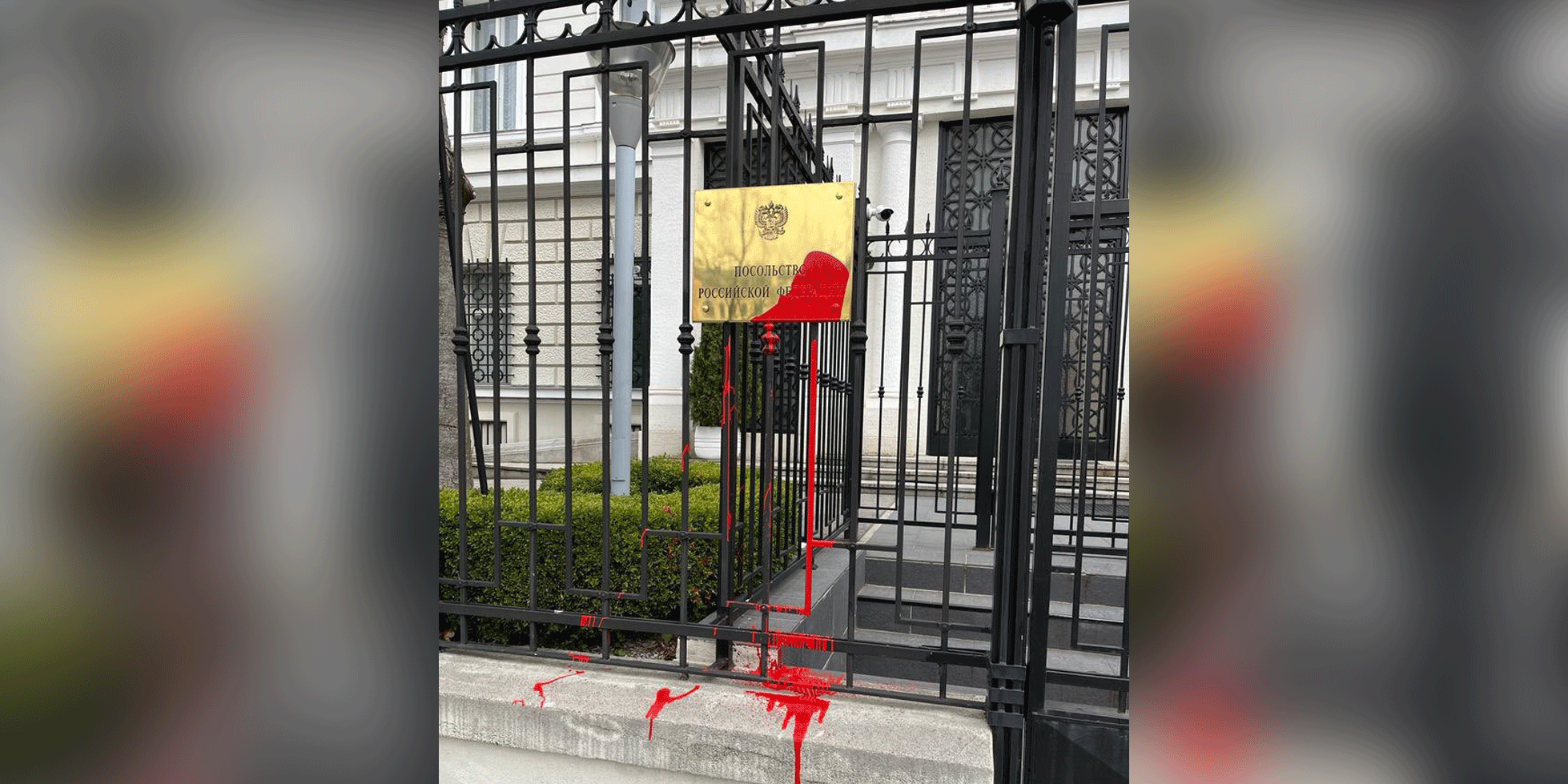 Anders als von russischer Seite behauptet soll laut Angaben der Wiener Polizei am Sonntag kein Motorradfahrer, sondern ein Radfahrer einen roten Farbbeutel auf das Eingangsschild der Botschaft Russlands im dritten Wiener Gemeindebezirk in Wien geworfen haben. Die Handlung war von der Botschaft in sozialen Netzwerken selbst als "barbarische Aktion" bezeichnet worden.