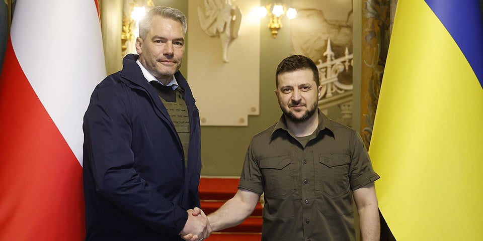 Von ukrainischer Seite auf Österreichs Weigerung, einen Gasimportstopp zuzustimmen, angesprochen, unterstrich der Kanzler die Position, dass Sanktionen jene treffen sollten, gegen die sie gereichtet seien. Ein Ende der Gaslieferungen könnte aber in Österreich schwerwiegende wirtschaftliche und dann auch soziale Folgen haben. Eine Gefahr, dass die Sanktionen von Firmen wie der in Russland groß engagierten Raiffeisen Bank International (RBI) umgangen werden könnten, stellte der Kanzler auf Anfrage in Abrede. Das würde in Österreich auf keinerlei Akzeptanz stoßen. Zudem sei die RBI aber auch ein großer Arbeitgeber in der Ukraine. Selenskyj forderte seinerseits weitere Sanktionen gegen Russland. "Jede Kopeke, jeder Dollar, jeder Euro, der dorthin geht, wird für den Krieg verwendet."