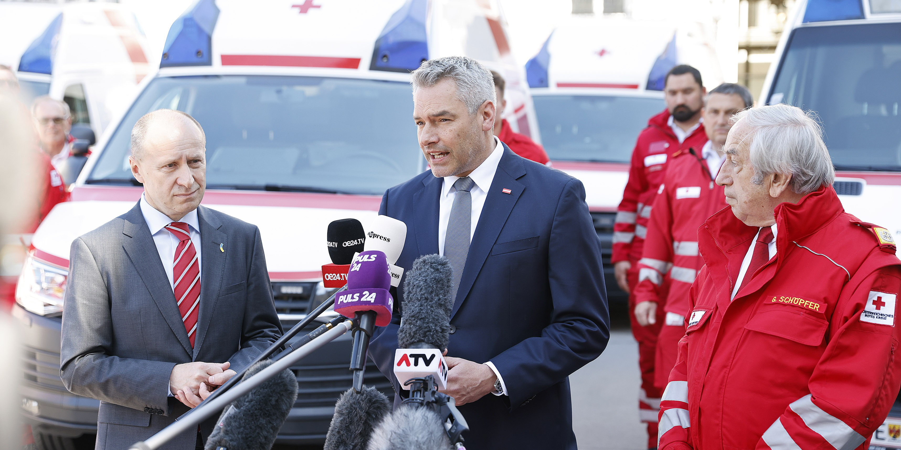 Wien/Kiew (Kyjiw)/Moskau. Österreich stellt der Ukraine insgesamt 20 Rettungsfahrzeuge zur Verfügung. Acht davon wurden am Freitag von Bundeskanzler Karl Nehammer (ÖVP) und dem Präsidenten des Österreichischen Roten Kreuzes, Gerald Schöpfer, im Beisein des ukrainischen Botschafters in Österreich, Wassyl Chymynez (Vasyl Khymynets), in Wien verabschiedet. Es sei "der Anfang der Hilfe und nicht das Ende", versprach Nehammer. Ein Embargo gegen russisches Gas schloss er erneut aus.