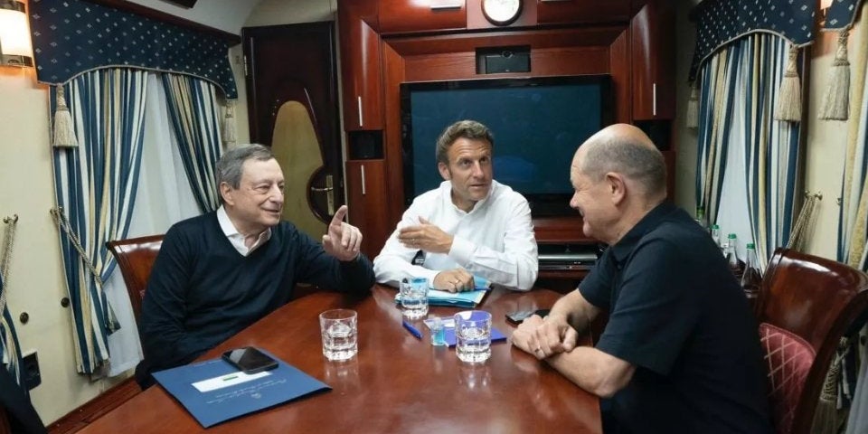 Der deutsche Bundeskanzler Olaf Scholz, der französische Präsident Emmanuel Macron und der italienische Premierminister Mario Draghi sind am Donnerstag mit einem Sonderzug in der ukrainischen Hauptstadt Kiew eingetroffen. Dort wollen sie mit dem ukrainischen Präsidenten Wolodymyr Selenskyj über weitere Unterstützung für das von Russland angegriffene Land sprechen und über den Wunsch der Ukraine, der Europäischen Union beizutreten.