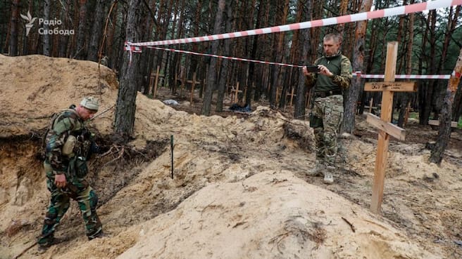 "Ich kann sagen, dass es sich um eine der größten Begräbnisstätten in den befreiten Gebieten handelt", sagte der Chef der Ermittlungsbehörde der Polizei im Gebiet Charkiw, Serhij Bolwynow gegenüber Sky News. Er kündigte an, alle Leichen forensisch untersuchen zu lassen. "Einige starben durch Artilleriebeschuss, andere starben durch Luftangriffe", so Bolwinow.