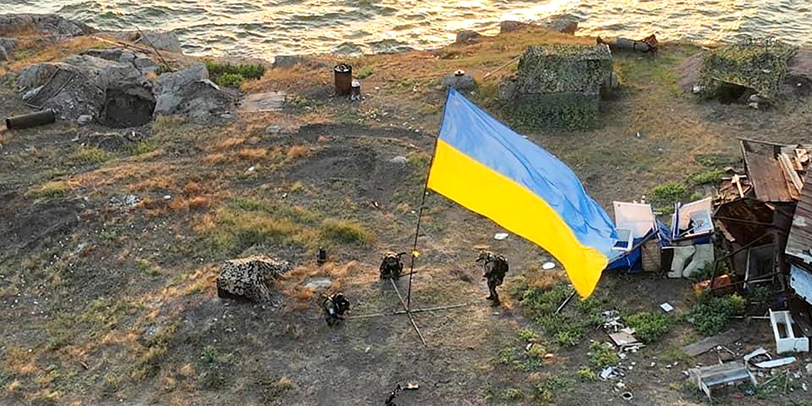 Ukrainische Soldaten hissten auf der symbolträchtigen und von Russlands Truppen verlassenen Schlangeninsel im Schwarzen Meer wieder die ukrainische Flagge.