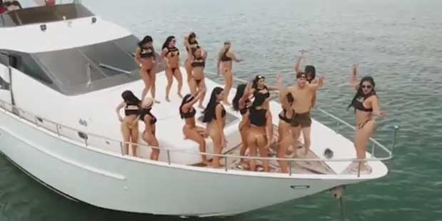 Im Promotionvideo für den Urlaub geht es bereits richtig zur Sache: Ein Mann isst Früchte von den nackten Brüsten einer Prostituierten, etwas später übergießt er eine auf einer Jacht mit Champagner.