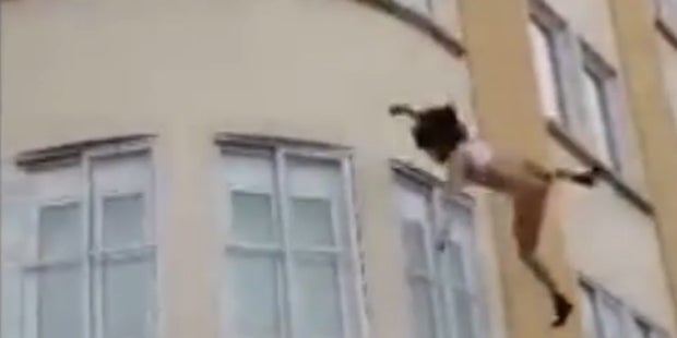 Überrascht wacht die Spanierin aus und sieht nur mehr einen Ausweg. Panisch flieht sie aus ihrer Wohnung und rettet sich – nur mit Unterwäsche bekleidet – aus dem Fenster. Dort will sie die Fassade hinunter klettern, verliert aber den Halt und stürzt aus dem dritten Stock in die Tiefe. Unten fangen sie andere Bewohner mit einer angespannten Decke auf. Die junge Frau erleidet nur leichte Verletzungen.