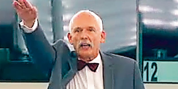 Fassungslose Gesichter bei der EU-Parlaments-Sitzung am Dienstag: Der polnische Abgeordnete Janusz Korwin-Mikke zeigt nach einer kurzen Rede von 20 Sekunden den Hitlergruß. Dabei rief er: "Ein Volk, ein Reich, ein Ticket".