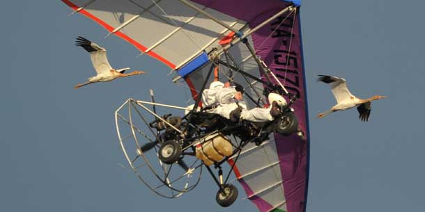 Nach Tauchgängen, Tigerjagden und sonstigen Muskelspielen zeigt er diesmal in großer Höhe, dass ihm auch Federvieh folgt. Am Steuer eines Motor-Flugdrachens fliegt Putin gemeinsam mit Kranichen durch das nördliche Sibirien, geleitet elternlose Jungvögel in Richtung Süden.