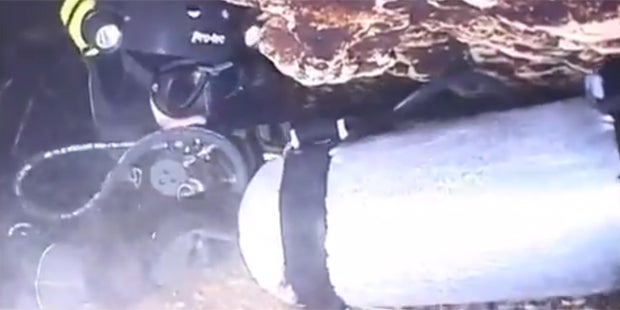 In einem Video, das auf Twitter veröffentlicht wurde, sieht man die engste Stelle der Höhle, die die Rettungskräfte mit den Kindern passieren müssen. Die Taucher müssen dabei ihre Sauerstoffflaschen abnehmen und sich durch nur 38 Zentimeter winden - mit den Kindern, die noch gerettet werden müssen.