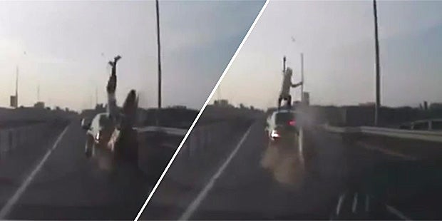 Biker rast in Auto, wirbelt durch die Luft und landet am Dach des Fahrzeugs.