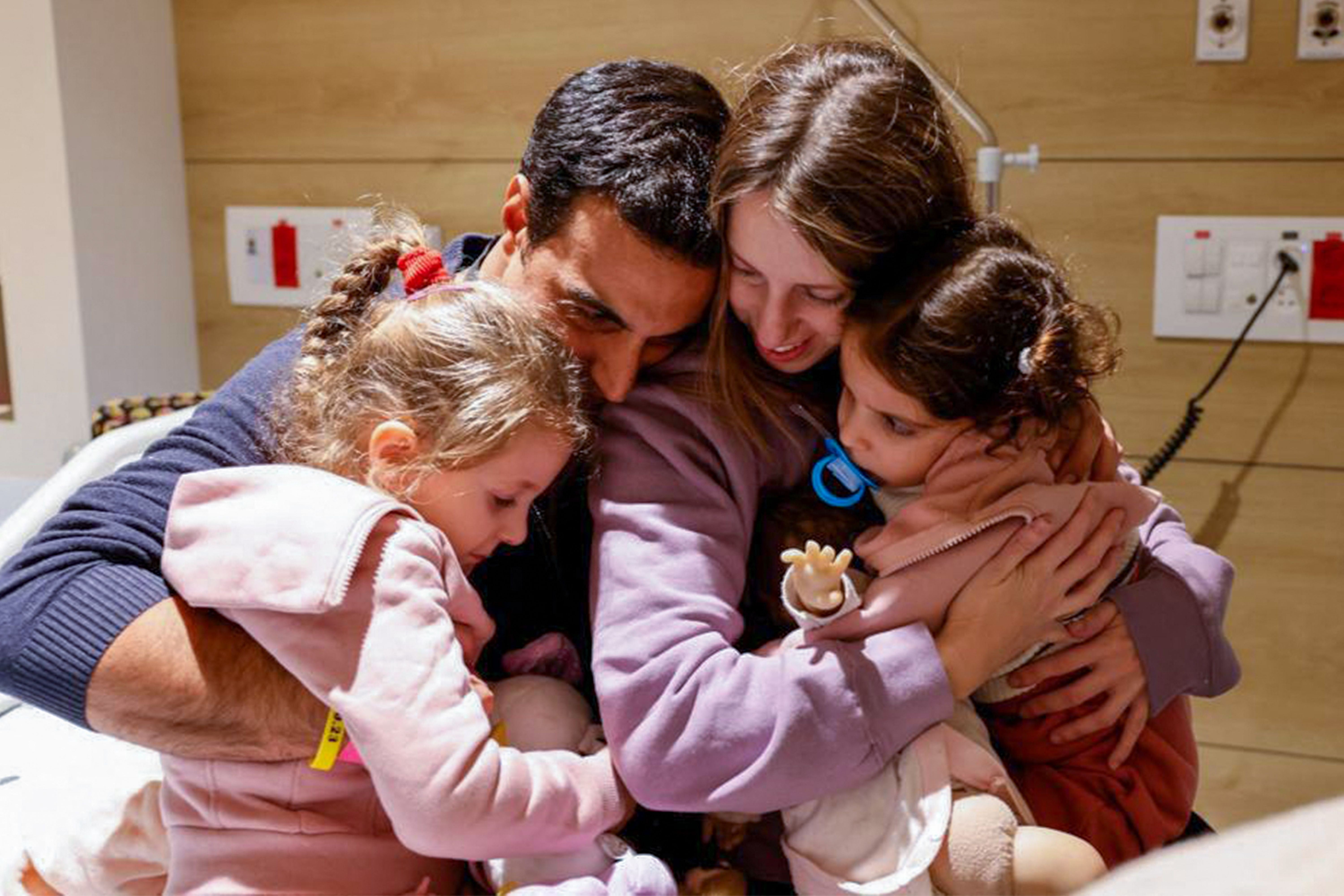 Familie wiedervereint: Yoni Asher mit seinen Töchtern Aviv und Raz sowie seiner Frau Doron nach deren Freilassung durch die Hamas.