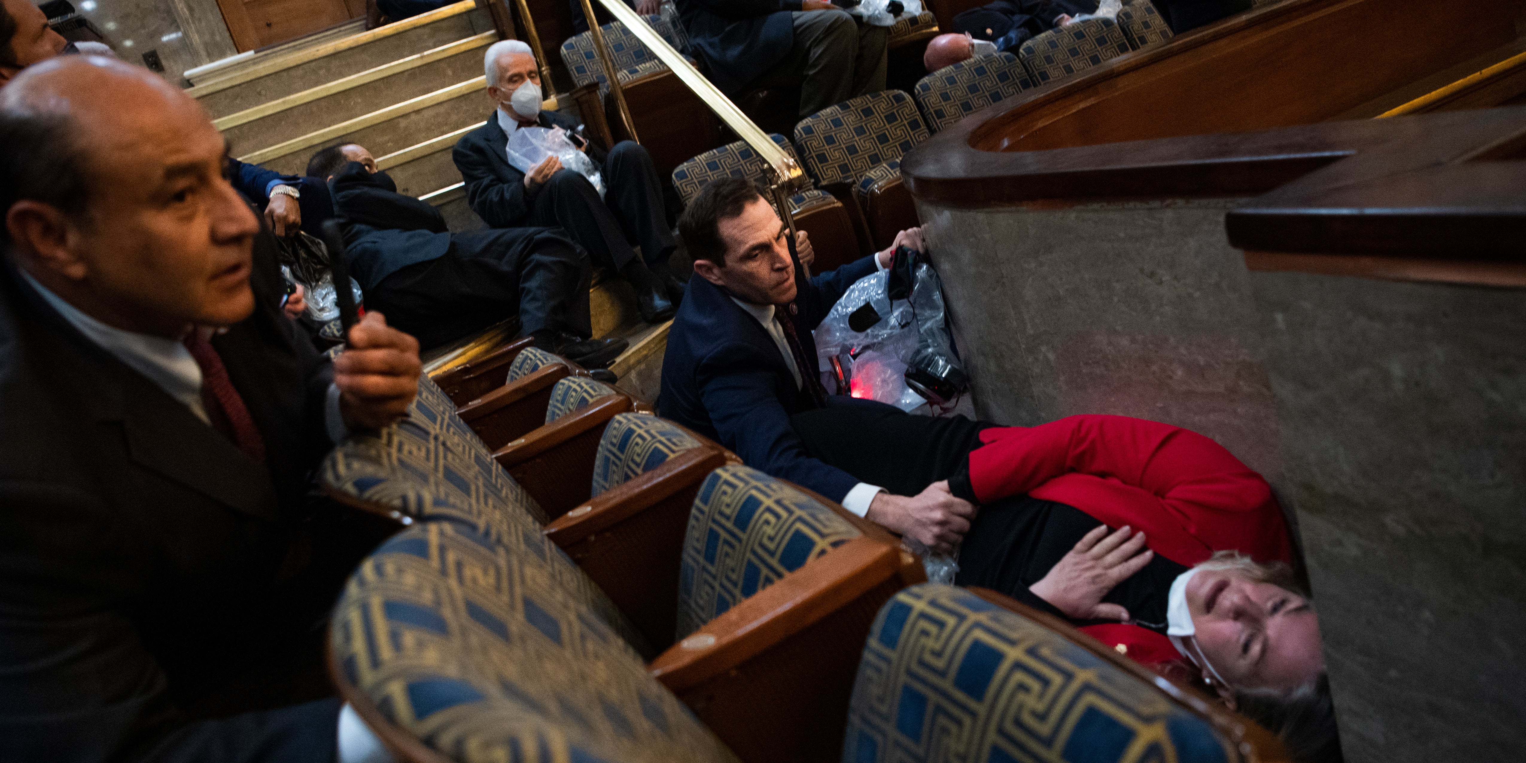 Völlig panisch liegen die US-Politiker am Boden, während Sicherheitsleute den Mob aus radikalen Trump-Anhängern versucht im Zaum zu halten.