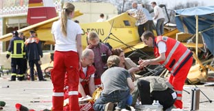 Stehen kam. Der Pilot und vier Zuschauer wurden schwer verletzt. Elf