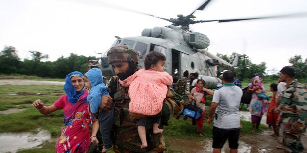 Die Streitkräfte hätten per Boot und mit Helikoptern 17.000 Menschen aus ihren Häusern gerettet, nachdem der Fluss Jhelum im Bundesstaat Jammu und Kaschmir über die Ufer trat und Dämme durchbrach. Zahlreiche Bewohner retteten sich in höhere Stockwerke, warteten auf Balkonen oder kletterten auf Dächer. Viele hatten weder Strom noch frisches Wasser, auch Telefonleitungen und Handynetze waren zusammengebrochen. Neue Todeszahlen veröffentlichten die Behörden zunächst nicht. Bis Sonntag waren knapp 150 Menschen in den Fluten gestorben. Auf der anderen Seite der Grenze in Pakistan gab es 110 Tote.