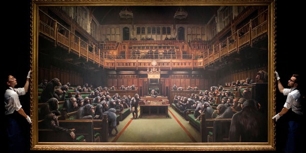 "Unabhängig davon, auf welcher Seite man in der Brexit-Debatte steht, gibt es keinen Zweifel, dass dieses Werk heute relevanter ist als jemals zuvor", hatte Sotheby's vor der Auktion erklärt. Banksy habe die "kompliziertesten politischen Situationen der Gesellschaft" in nur einem einzigen Bild destilliert, schwärmte Alex Branczik, der bei Sotheby's für zeitgenössische europäische Kunst verantwortlich ist. "Was wir in den vergangenen Wochen und Monaten im Unterhaus gesehen haben, ist zu einer täglichen Seifenoper geworden." Mit dem Gemälde zeige Banksy den Rückschritt der ältesten parlamentarischen Demokratie in eine Welt von "tribalistischem, animalischem Verhalten".