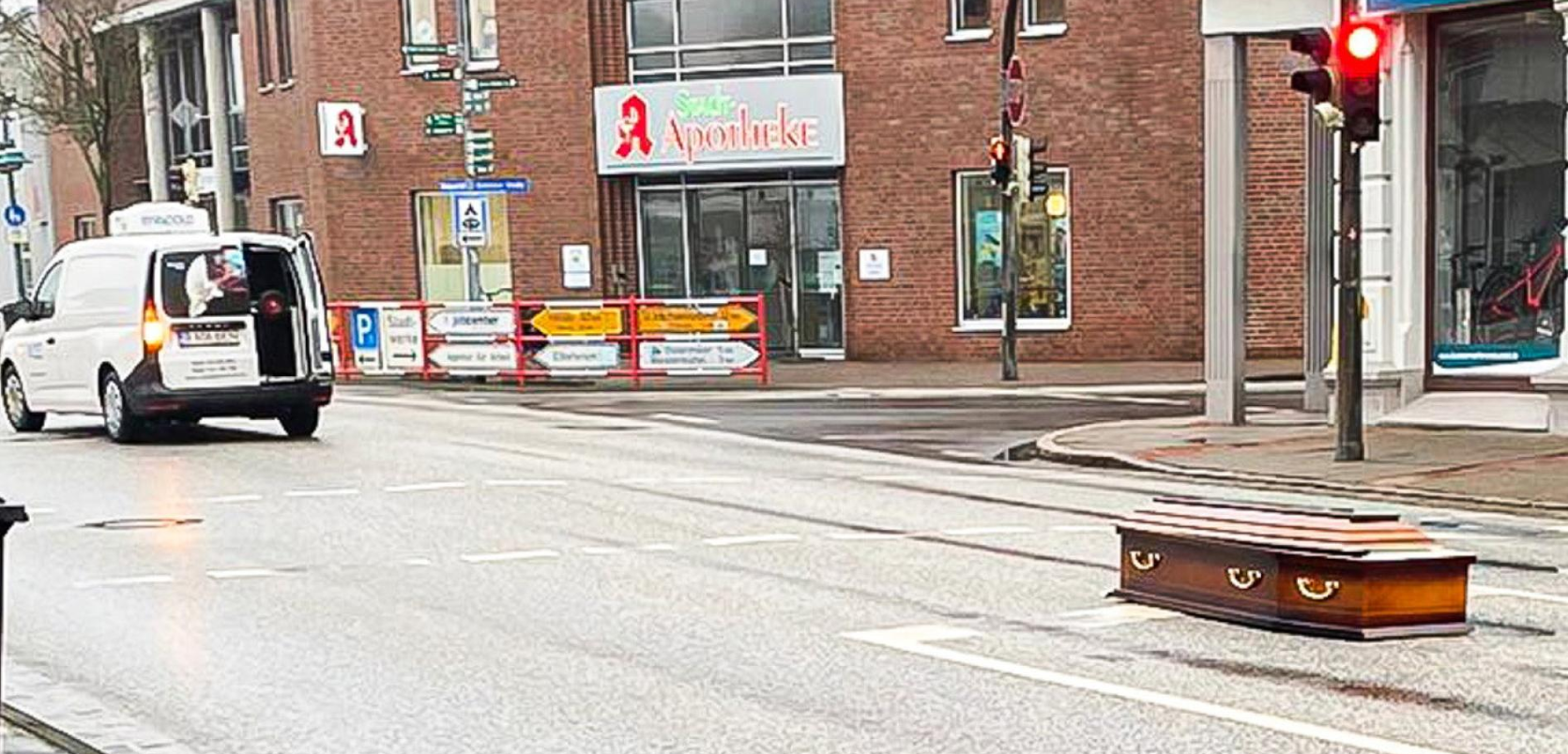 Holprige letzte Reise: In Deutschland fiel ein Sarg mitten auf der Kreuzung aus dem Transporter.