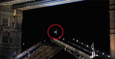 Der australische Freestyle-Motocross-Biker Robbie Maddison funktionierte das Wahrzeichen Londons – die Tower Bridge – kurzerhand in eine spektakuläre Sprungschanze um. Mit rund 70 km/h hob er auf der Nordseite der geöffneten Brücke ab, riskierte 22 Meter über der Themse einen Backflip und landete auf der Südseite des Londoner Wahrzeichens.