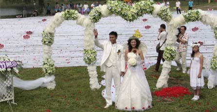 Die rund 200 Gäste benötigten mehr als drei Stunden, um Lin Rongs 2.162 Meter lange Schleppe auszurollen und 9.999 rote Seidenrosen daran zu befestigen, wie die Nachrichtenagentur Xinhua am Donnerstag berichtete. Lins Mann Zhao Peng hat nach eigenen Angaben bereits einen Eintrag im Guinness Buch der Rekorde beantragt - der bisherige Rekord steht bei 1.579 Metern.