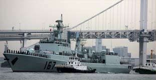 Erstmals seit dem Ende des Zweiten Weltkriegs ist am Mittwoch ein chinesisches Kriegsschiff zu einem historischen Besuch in Japan eingetroffen. "Willkommen in Japan", rief der Marine-Stabschef der japanischen Selbstverteidigungsstreitkräfte, Admiral Eiji Yoshikawa, auf Chinesisch der Mannschaft des Zerstörers "Shenzhen" zu. Hunderte von Menschen fanden sich zu einer Begrüßungszeremonie im Tokioter Hafen Harumi ein, einige schwenkten chinesische Nationalfahnen und führten Drachen- und Löwentänze für die 345 Besatzungsmitglieder auf.