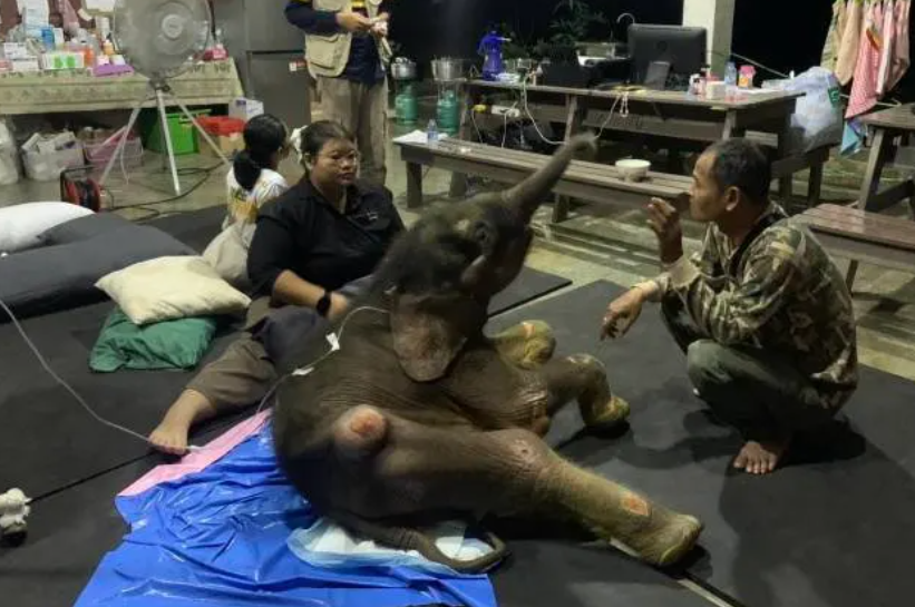 Khao Tom war Ende September in einem Waldgebiet der Provinz Kanchanaburi gefunden worden – verletzt, dehydriert und von seiner Herde getrennt. Das geschwächte Kalb war in eine Grube gestürzt und konnte sich nicht mehr selbst befreien. Ein Ranger entdeckte das Tier zufällig und brachte es in das Wildtierzentrum Bueng Chawak, wo es seither rund um die Uhr betreut wird.