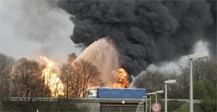 erst konnten die Feuerwehrleute mit Wasser löschen und den Acrylnitril-Tank