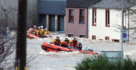 Die heftigsten Regenfälle in der Geschichte Großbritanniens haben am Freitag den malerischen Lake District unter Wasser gesetzt und erhebliche Schäden angerichtet. Binnen kürzester Zeit traten Bäche und Flüsse über die Ufer. Fast 1.000 Häuser wurden überflutet. Mehr als 200 Menschen mussten von Bergungsmannschaften mit Schlauchbooten und Hubschraubern aus ihren Häusern geborgen werden. Ein Polizist kam beim Einsturz einer Brücke ums Leben.