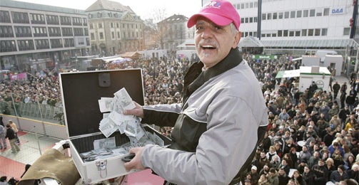 Von einem Kran aus ließ der 49 Jahre alte Lkw-Fahrer die Scheine herabfallen. Auf jeweils zehn Teilnehmer ging ein Betrag von gut 5.000 Euro nieder. Insgesamt sollten so bis zum Abend 75.000 Euro unters Volk gebracht werden.
