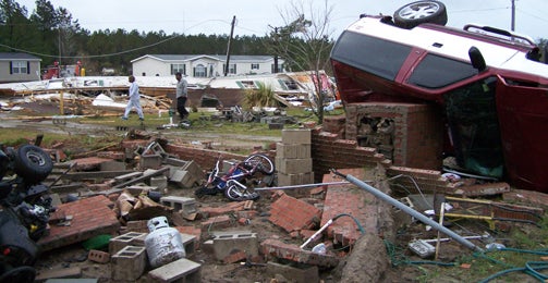 Der Tornado hinterließ eine Spur der Verwüstung: Selbst Ziegelhäuser seien schwer beschädigt worden, berichtete eine Reporterin des TV-Senders WECT. Der Sturm hob Wohnmobile in die Luft und stürzte sie um. Autos wurden wie Spielzeuge umhergewirbelt, Bäume knickten um, Stromleitungen wurden von der Naturgewalt zerrissen.