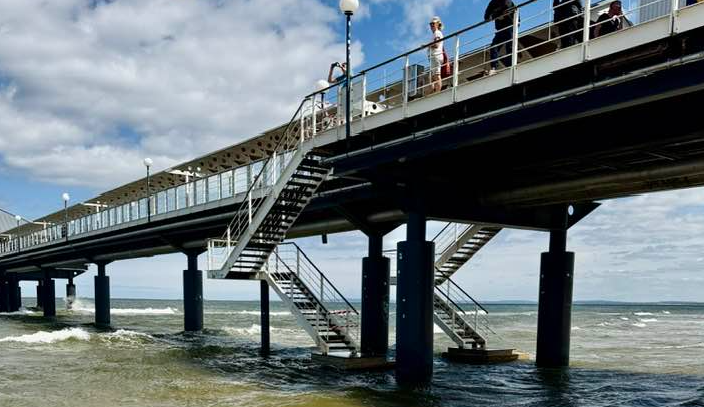 Ein zentraler Strandabschnitt unterhalb der Seebrücke Heringsdorf ist derzeit nicht zugänglich – die Treppe, die normalerweise direkt zum Wasser führt, wurde aus Sicherheitsgründen gesperrt.