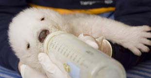 Der Nürnberger Oberbürgermeister Ulrich Maly (SPD) gab am Freitag bekannt, dass der kleine Eisbär "Flocke" heißen wird. Eine Jury mit Vertretern der Stadt und des Tiergartens hatte den Namen aus Zehntausenden von Vorschlägen ausgewählt. Das rund fünf Wochen alte Eisbärenweibchen wird im Zoo mit der Hand aufgezogen, seitdem es vor eineinhalb Wochen von seiner Mutter getrennt worden war.