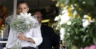 Nein, er hat ihn nicht vergessen: Der 16. Hochzeitstag ist für Barack Obama wichtig. Nach einem Wahlkampfauftritt in Abington im Bundesstaat Pennsylvania ließ Obama am Freitag seinen Fahrzeugkonvoi vor einem Blumenladen anhalten und verbrachte dort geschlagene 20 Minuten. Er wählte für seine Frau wunderschöne, weiße Rosen aus. Er freue sich auf ein "romantisches Abendessen" mit seiner Frau Michelle in Chicago, ließ Obama die Reporter, Wachleute und Fans wissen.