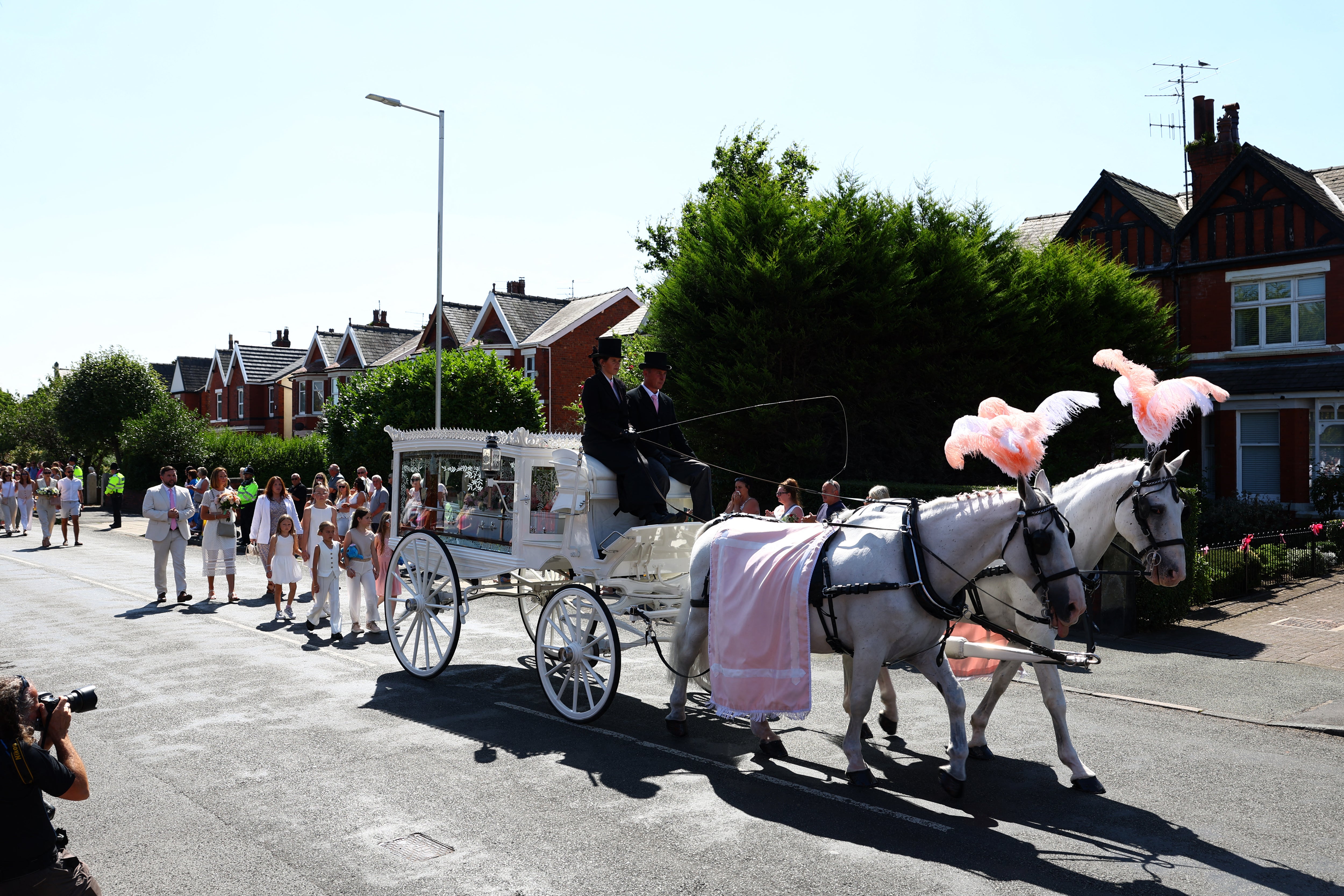 Hunderte Menschen säumten die Straße und applaudierten, als der Leichenzug vor einer Kirche in Southport eintraf. Sowohl der von Pferden gezogene Leichenwagen, als auch der mit Blumen geschmückte Sarg waren weiß. Auch die Trauergemeinde war weiß gekleidet. Die Farbe gilt als Symbol der Unschuld gestorbener Kinder. Auch pinkfarbene Luftballons waren zu sehen.