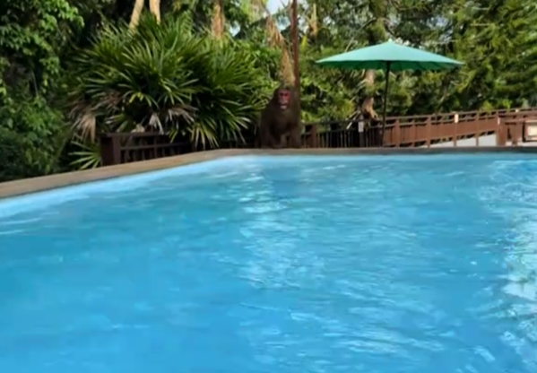 Plötzlich sichtete er einen Affen, der aus dem Gebüsch geradewegs auf ihn stürmte. Er erschrak sich und ergriff die Flucht. Und dann das blanke Szenario! Es kamen noch mehr Affen aus allen Ecken - und sie alle versammelten sich um den Pool.