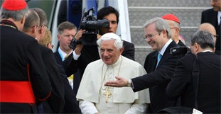 Papst Benedikt XVI. ist zu einem neuntägigen Besuch in Australien eingetroffen, bei dem der 23. Weltjugendtag in Sydney im Mittelpunkt steht. Das Oberhaupt der katholischen Kirche wurde am Sonntag nach seiner Ankunft am Flughafen von Sydney von Australiens Premierminister Kevin Rudd und Sydneys Erzbischof George Pell begrüßt.