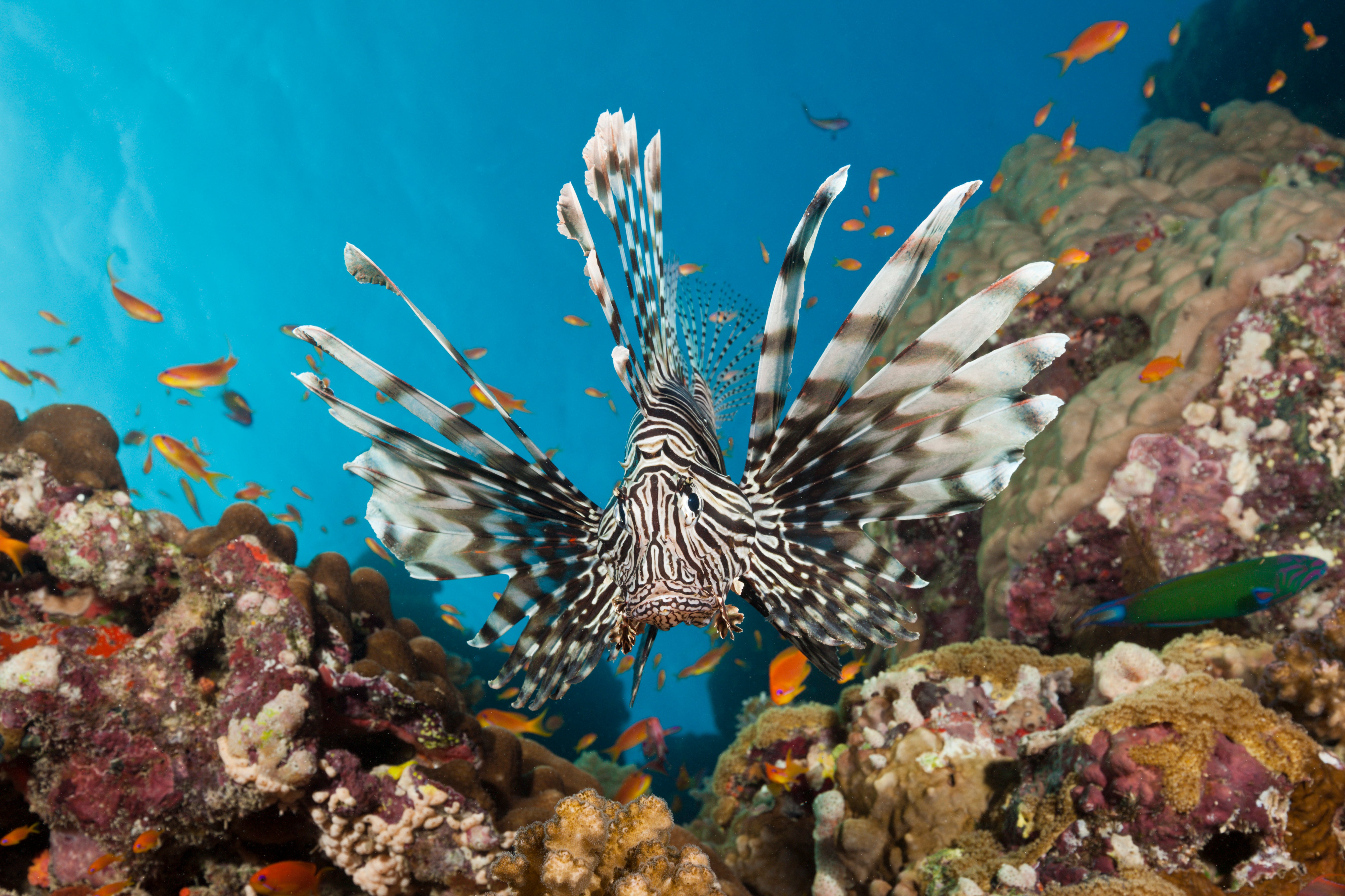 Taucher und Schwimmer: NIEMALS die rot-weiß gestreiften Killer berühren - auch tote Löwenfische sind lebensgefährlich giftig! Bei Stich sofort aus dem Wasser und Notarzt rufen!