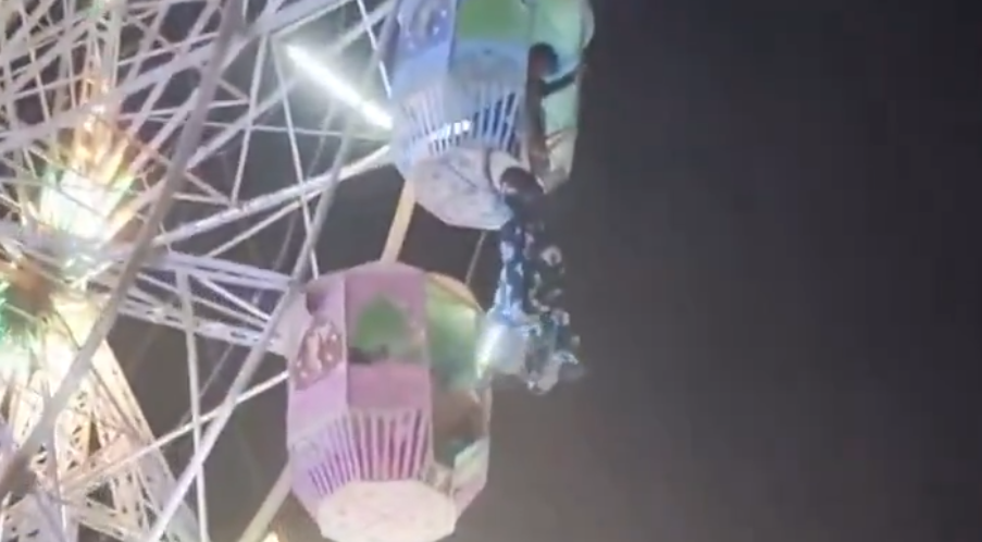 Der Vorfall ereignete sich in der Stadt Bhatapara. Ein auf Instagram geteiltes Video zeigt den Moment, in dem die Frau während der Fahrt aus der Kabine fällt und im Gestänge des Riesenrads hängen bleibt. Verzweifelt versucht sie, sich zurück in die Gondel zu ziehen.