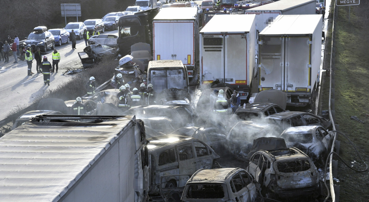 Auf der anderen Fahrbahnseite in Richtung Budapest waren zwei Fahrzeuge kollidiert. Die Folge war eine Totalsperre der M1. 16 Rettungswagen, vier Hubschrauber sowie 70 Feuerwehrleute aus sieben Städten waren im Einsatz.