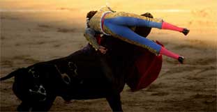 Schwere Verletzung: Der Stier spießte den Torero auf - und verletzte ihn am Oberschenkel schwer. Jose Tomas führte den Kampf dennoch zu Ende.