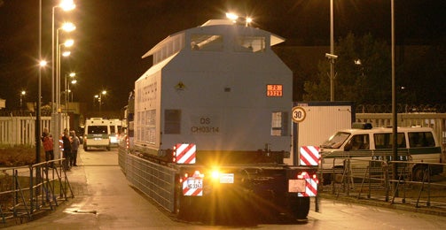 zwölf Behälter mit den Überresten abgebrannter Brennelemente gegen sechs Uhr