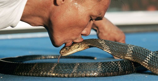 Um ins "Guinness Buch der Rekorde" zu kommen, hat ein Thailänder 19 giftige Königskobras geküsst.