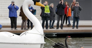 Der bekannte Trauerschwan Petra ist eine Woche nach der Trennung zu seinem geliebten Tretboot zurückgekehrt. Viele Pressevertreter, darunter fünf Fernsehsender, beobachteten am Freitag das Wiedersehen mit dem Boot in Schwanenform, wie der Münsteraner Zoo mitteilte. Petra sei auf einem Teich des Zoos eingefangen und mit einem Motorboot zum nahe gelegenen Aasee gebracht worden. Dort wird das Tretboot von einem Bootsverleih genutzt.