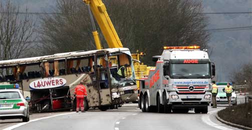 Bei einem schweren Busunfall in Bayern sind am Sonntag in der Früh zwei Menschen lebensgefährlich verletzt worden. Der mit 42 belgischen Skiurlaubern besetzte Bus kam auf der Autobahn A3 bei Würzburg von der Fahrbahn ab, wie ein Polizeisprecher sagte. Von den Insassen, außer der Gruppe noch Fahrer und Beifahrer, wurden demnach außerdem fünf weitere schwer verletzt; die übrigen Insassen erlitten leichte Verletzungen und Schocks. Insgesamt mussten 34 Männer und Frauen ins Krankenhaus eingeliefert werden. Unfallursache war nach ersten Erkenntnissen der Polizei ein Sekundenschlaf des Fahrers.
