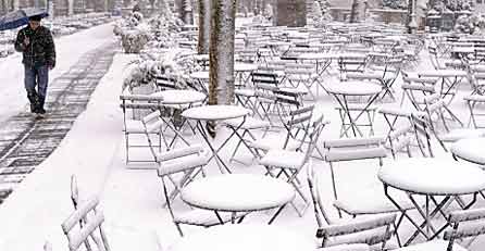 dicken Schneedecke liegt. Die Straßen waren weitgehend menschenleer, nachdem